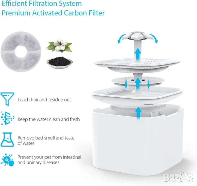 Силна способност за филтриране: По-големите частици се отделят от външната тава, а филтърът с активен въглен непрекъснато пречиства и омекотява твърдата чешмяна вода, премахва напълно космите, утайката и остатъците.