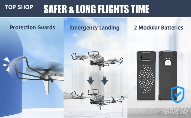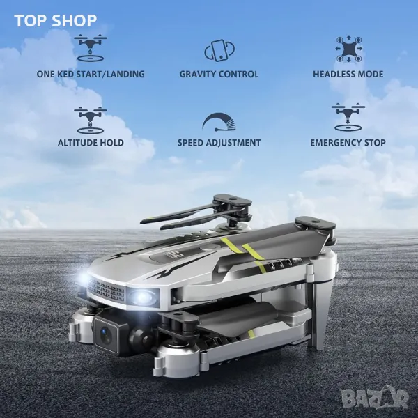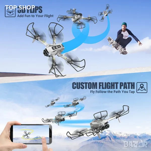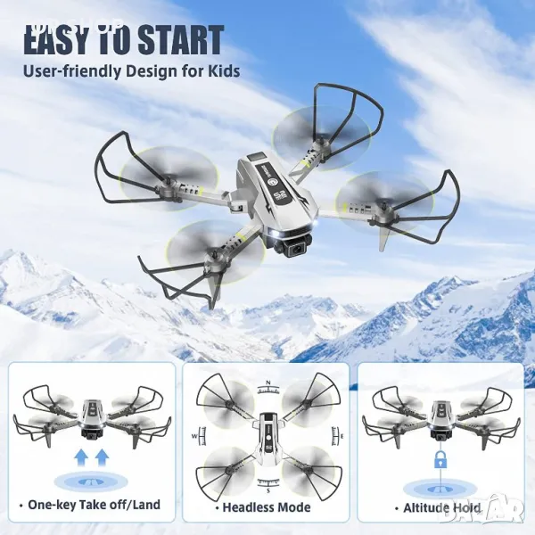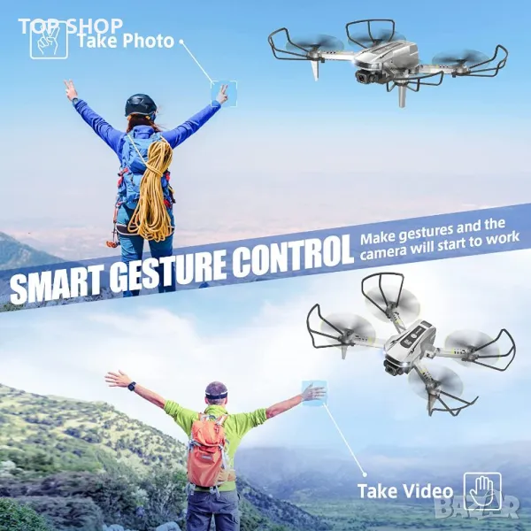 Контрол с жестове и задържане на височината: Тези страхотни неща са интересен инструмент за фотография. Поставете знак V или длан пред камерата, дронът с дистанционно управление може автоматично да прави снимки или видеоклипове. Altitude Hold позволява на дрона да се рее във въздуха, дори когато ръцете ви са извън контролера. Супер лесен за управление за начинаещи!
