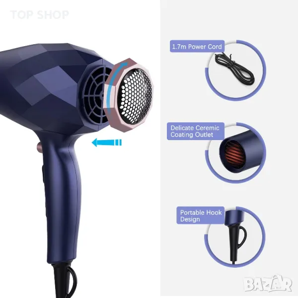 ❤️【Пътнически сешоар】 - Вграден променливотоков двигател от висок клас, 220V-240V волта, дълъг живот, ниски нива на отказ. Има кука, удобна за закачане. 1,7 м захранващ кабел осигурява достатъчна дължина, когато сушите коса.