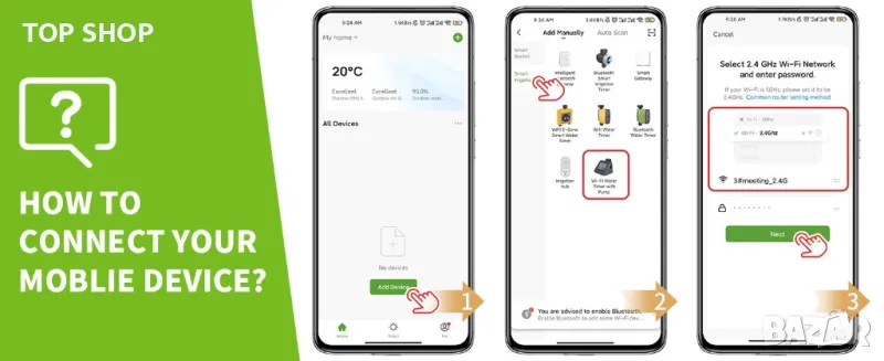 【Безгрижно поливане】 С функцията „Автоматично“ персонализирайте вашите планове за напояване с местното време, температури, влажност, изгрев/залез или седмици. Настройваем времеви режим, чиято продължителност на поливане е от 20 секунди до 30 минути, а честотата на поливане е от 1 час до 24 часа или от 1 ден до 7 дни.