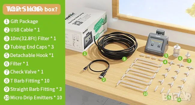 【Ефективно пестене на вода】 Системата за автоматично поливане доставя вода дълбоко в почвата, спестявайки 70% вода в сравнение с традиционния спрей за напояване. Той е достатъчно преносим, за да виси на кофа във вашата спалня, офис, балкон или градина за автоматично поливане на стайни растения. Пакетът от комплекти отговаря на напояването на 10 растения, които са 1/4" тръби (32.8Ft), микро капкови емитери x10, фитинг с T-образна греда x10, фитинг с напречна греда x3, фитинг с права греда x3, USBx1, крайни капачки на тръбите x3, филтър x1, ръчен* 1.