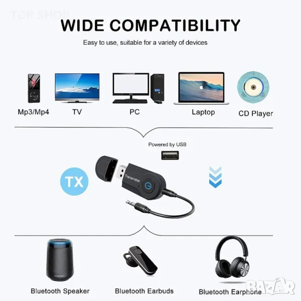 【Bluetooth предавател- приемник)】 Свържете се с аудио изходни устройства като телевизор, CD плейър, компютър, MP3/MP4 и предлагайте лесно сдвояване с Bluetooth приемници - Bluetooth високоговорител, безжични слушалки и др.