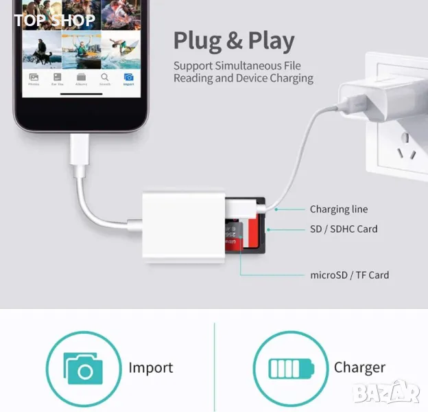 Този SD четец добавя възможност за зареждане на вашия телефон чрез включване на кабел за зареждане. Трябва да се отбележи, че самият четец на карти не е необходимо да се зарежда.