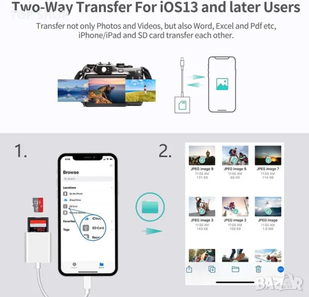 Четецът на карти Lightning към SD/Micro за iPhone/iPad не се нуждае от изтегляне на приложения на трети страни и не е необходима интернет връзка.
