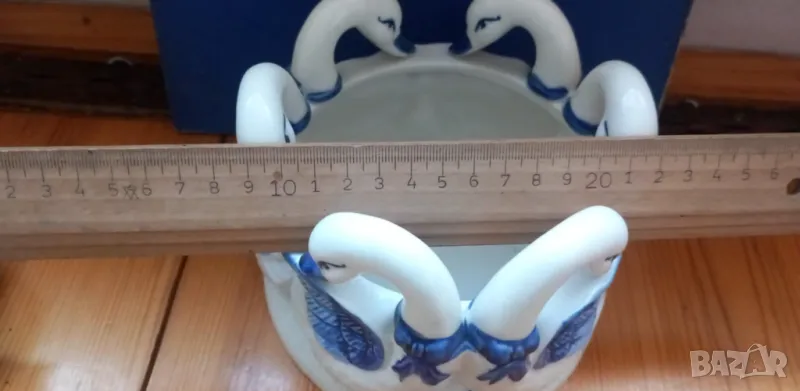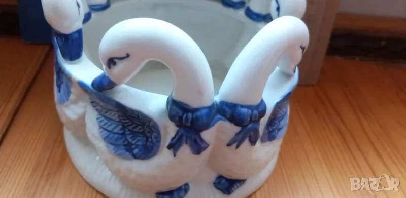 Много красива керамична кашпа с по два лебеда, стоящи един срещу друг. Декорирано детайлно и въздействащо. Без забележки е, размерите са на снимките.