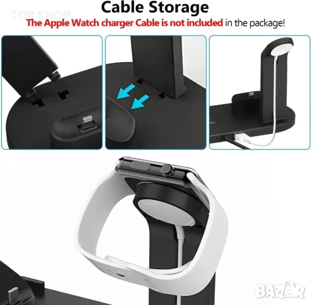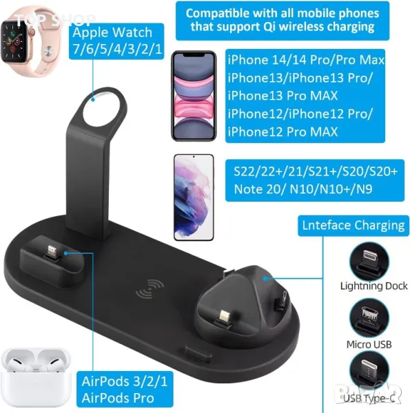 Широка съвместимост: Тази станция за зареждане на смартфони се предлага с микро USB, iPhone Lightning конектор и USB Type-C, които могат да поддържат всички ваши iPhone и Android устройства в едно устройство, спестявайки място. Безжично зареждане: Може да се зарежда със смартфони, които не могат да бъдат Qi съвместими с iPhone 13/12/11/10/pro/pro max/Xs/Xr/Xs Max/X и други смартфони с Qi. Поставка за зарядно за Apple Watch: Apple Watch SE/2/3/4/5/6/7 (зарядното устройство за Apple Watch не е включено) Зарядно за airpods: AirPods 2 / AirPods Pro