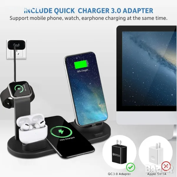 Безжично зарядно устройство 6 в 1, Съвместимо със зарядно за Airpods/iPhone/Apple Watchс,Qi устройст