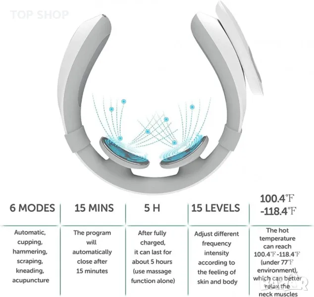 【Полезни съвети】 За да се гарантира безопасността и да се постигне най-добрият масажен ефект, преди употреба, моля, избършете врата с мокра кърпа и го изпитайте по-добре. Имплантирането на пейсмейкъри или носенето на метал в тялото е забранено за използване на този продукт.