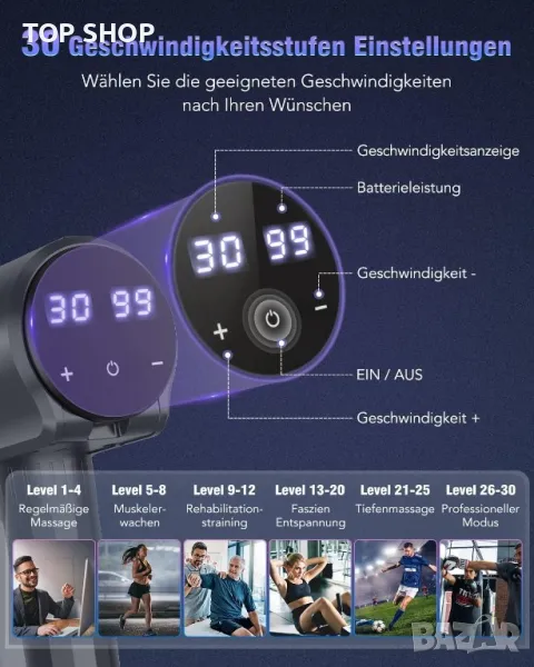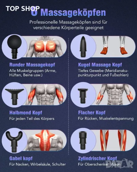 30 настройки на скоростта и 6 масажиращи глави: масажният пистолет има 6 масажиращи глави за различни области на тялото и предлага 30 регулируеми скорости в зависимост от мускулното напрежение. Работи с 1800 до 3300 удара в минута, подходящ е за облекчаване на болката и подобряване на еластичността на мускулите, както и разхлабване на връзките на мускулните влакна.