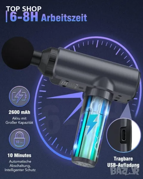 Дълъг живот на батерията: пистолетът за мускулен масаж е оборудван с литиево-йонна батерия с капацитет 2600 милиампер часа. Батерията може да работи до 8 часа без прекъсване след зареждане от 4 до 5 часа. Практичната функция на таймера гарантира, че устройството се изключва автоматично след 15 минути. Скритата охладителна система ефективно разсейва излишната топлина, което подобрява производителността и може да удължи живота на двигателя.