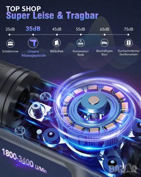 Супер тих: пистолетът за ръчен масаж има намаляване на шума. с който можете да контролирате шума в рамка от 45 dB, в зависимост от скоростта. Може да се използва в офиса или във фитнеса, без да причинява безпокойство.