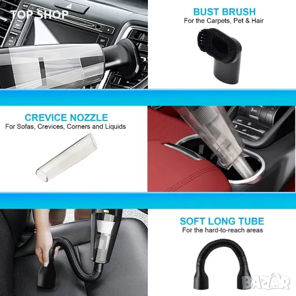 С мини прахосмукачката за мокро и сухо почистване прави магия срещу всякакъв вид мръсотия. Циклонната сила и силното засмукване на 110W мотор ще довършат всеки прах или отломки, кал или трохи от храна дори до разляти течности, пепел или косми от домашни любимци, кажете сбогом на онези труднодостъпни трохи, залепени под седалката на водача.