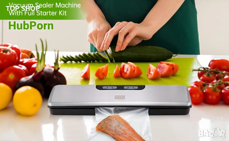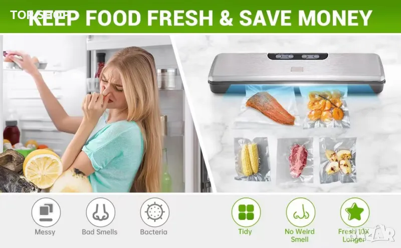Нашата система за вакуумно запечатване ще ви помогне да запазите храната свежа за 10 пъти по-дълго. Системата премахва въздуха - една от основните причини за мухъл и разваляне на храни - от торбите и създава херметично уплътнение, за да заключи свежестта. Този Пълен стартов комплект съдържа всичко необходимо, за да започнете вашето пътуване за спестяване на храна. Храните, запечатани с нашия вакуумен уред, намаляват хранителните отпадъци и спестяват парите ви.