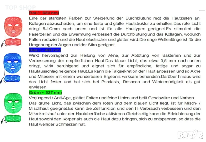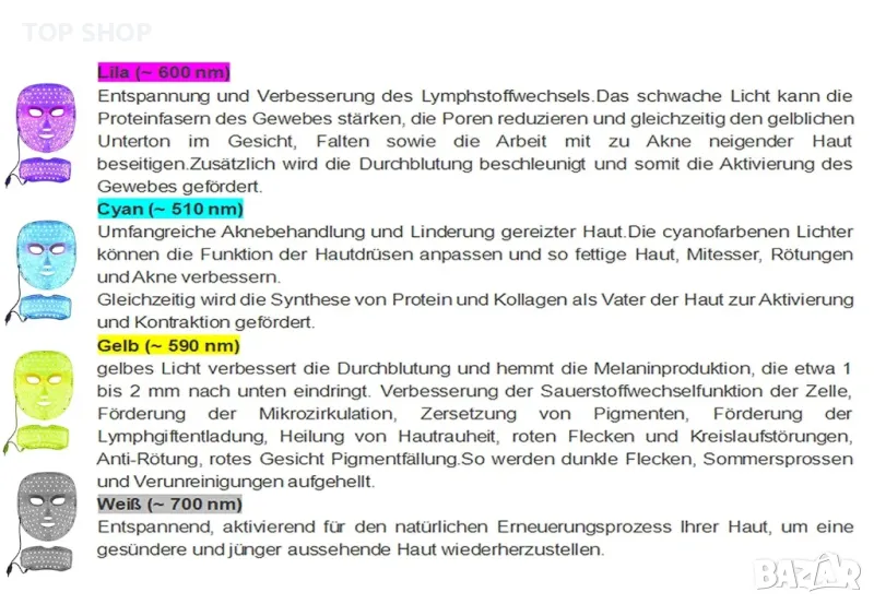 Червена светлина - Повишено кръвообращение и производство на колаген Синя светлина - Успокоява и стяга кожата Зелена светлина - Подобрява пигментацията, фините линии и против стареене Жълта светлина - изглажда кожата и намалява зачервяването Лилава светлина релаксираща, подобрява лимфния метаболизъм | Светлосиня светлина - Успокояващо, може да помогне при алергии | Бяла светлина - Ускорява тъканния метаболизъм