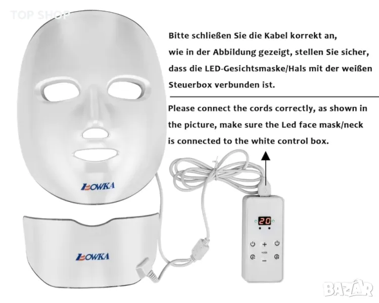 Контролерна кутия в батерия, безжична употреба, лесна за носене. 99+40 LED светлини покриват лицето и шията ви и са модернизирани, за да излъчват най-оптималните дължини на вълните с 5 нива на интензитет.