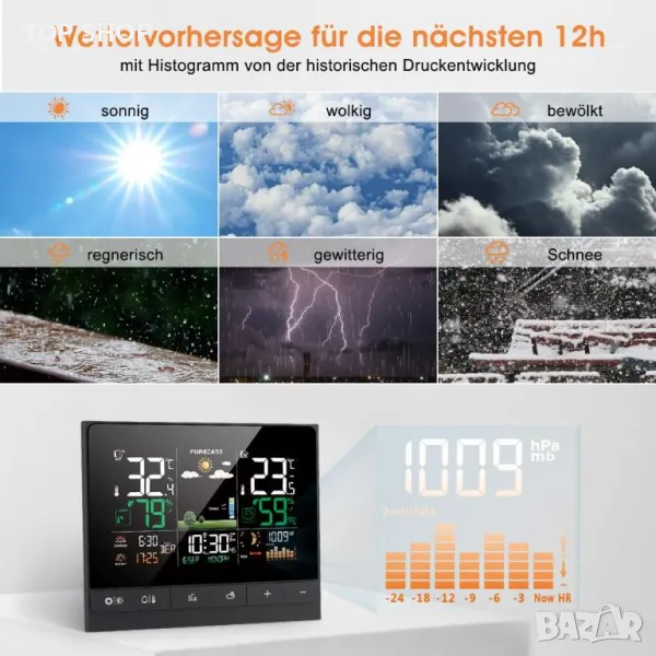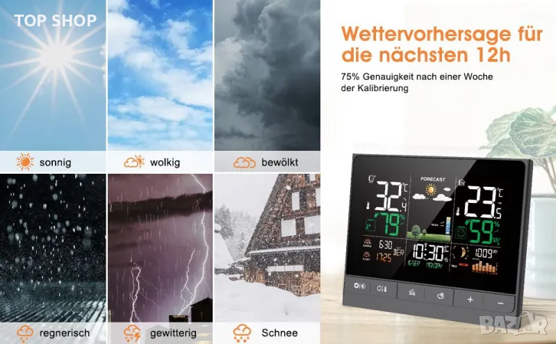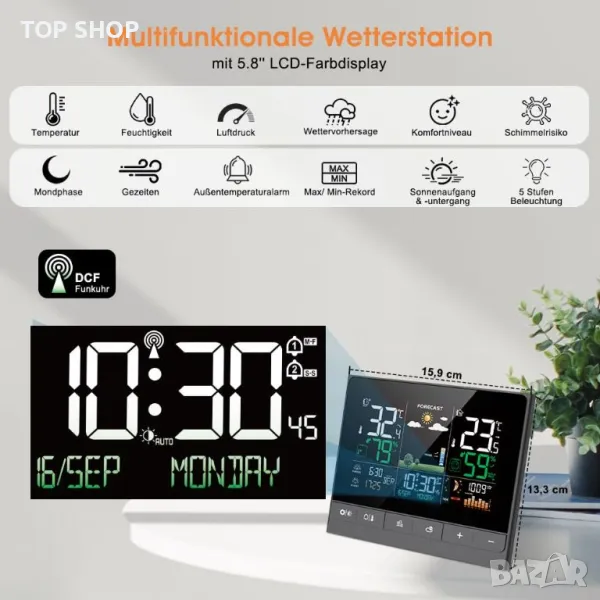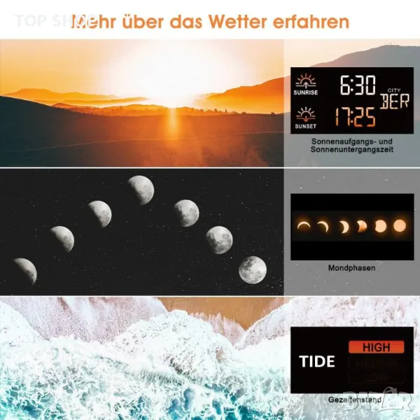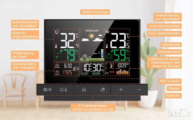 1. Радиоуправляем часовник с метеорологична информация: многофункционалната метеорологична станция предоставя по-точни данни в реално време: 1 радиочасовник (немски DCF радиосигнал на часовника се получава автоматично); 2 будилника с режим на дрямка; 3 вътрешна/външна температура и влажност с тенденции и максимум/мин запис; ④ регулируема аларма за външна температура; 5 ниво на комфорт и риск от мухъл на закрито; 6 изгрев/залез, лунна фаза. Вашият град Въздушно налягане и прогноза за времето; Нощен режим за осветление и др.