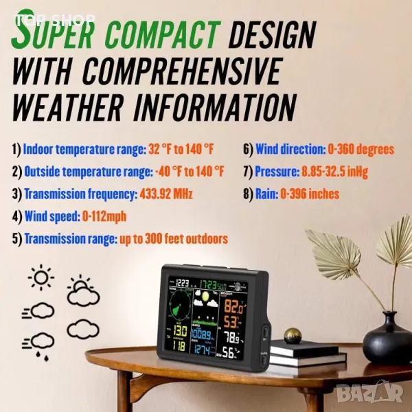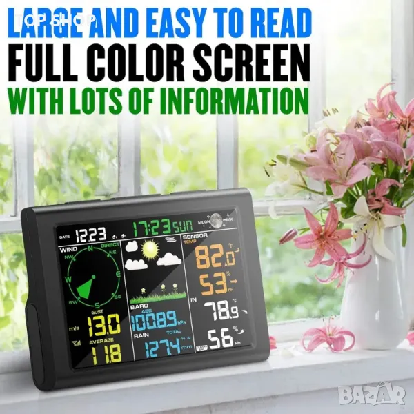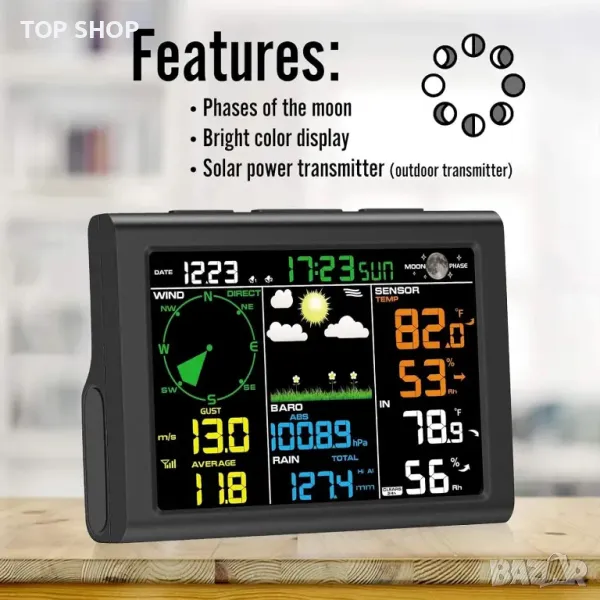 - Точен преглед на времето: Изпитайте комфорта на вашата лична информация за времето. Метеорологичната станция измерва скоростта на вятъра, посоката на вятъра, валежите, външната температура, слънчевата радиация и предлага прогноза за времето и фазите на луната.