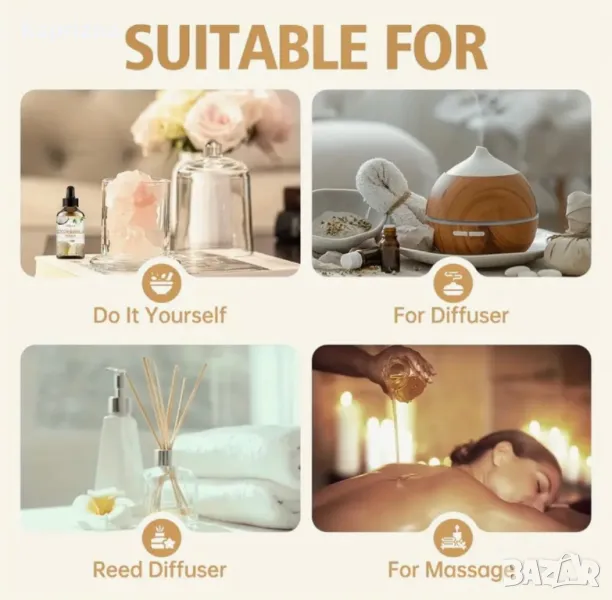 ✔Дифузер: капнете 2-10 капки върху дифузера като терапия, за да осигурите релаксиращ ефект и да получите ползите от етеричното масло.