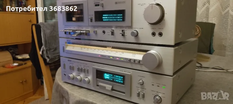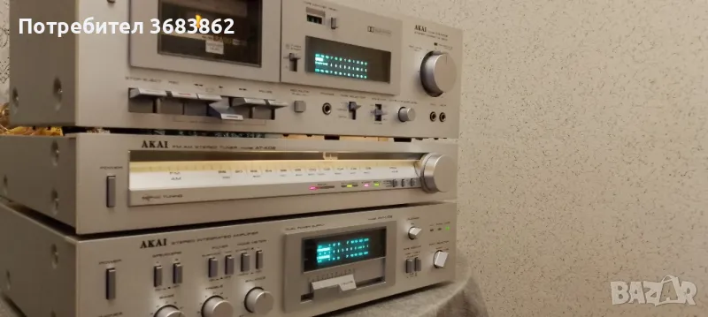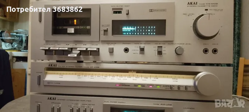 AKAI AM-U02, стерео тунер AKAI AT-K02 и стерео касетен дек AKAI CS-M02 в почти перфектно визуално състояние . Лек козметичен дефект на надписа на тунера. На дискът работи само единият канал. Manufacturer: Akai