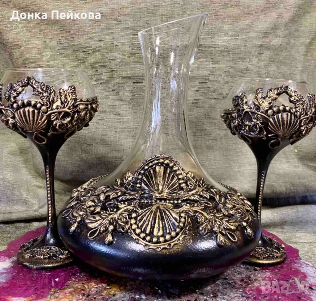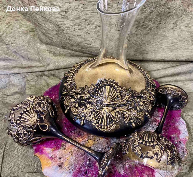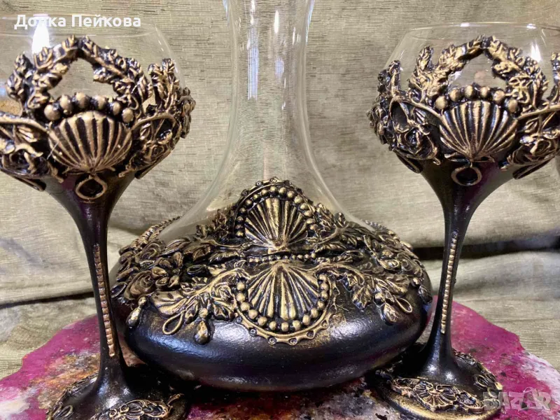 Ръчно изработен сервиз . декантер с две чаши в злато → Обява 49107928