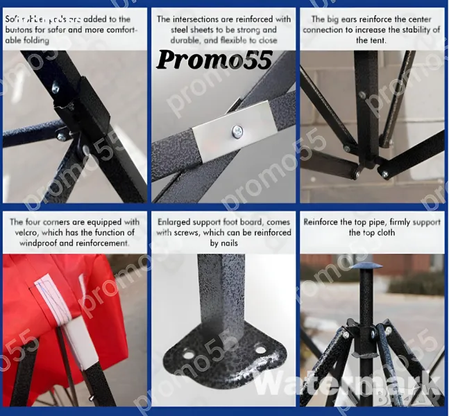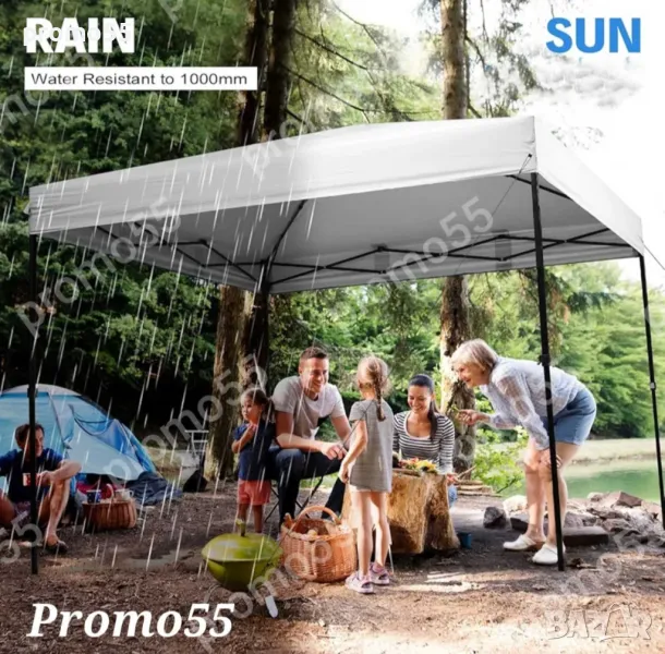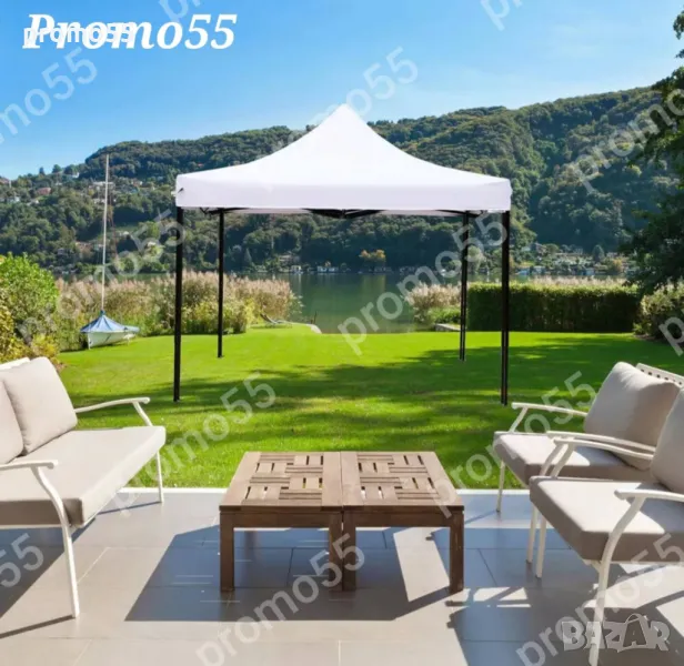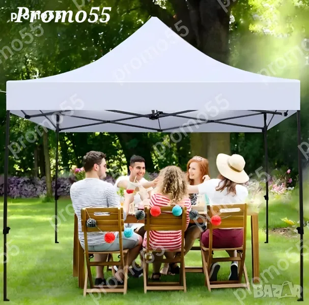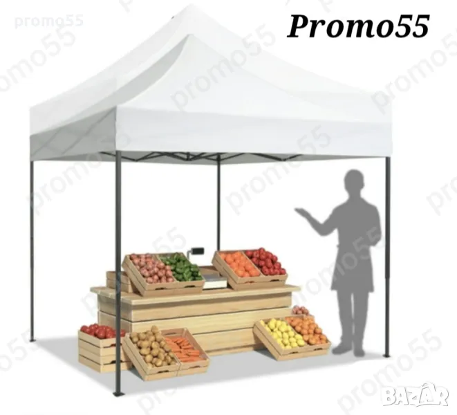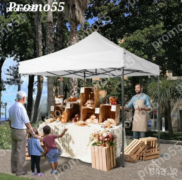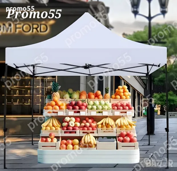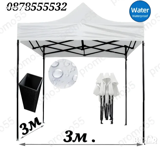 Шатра 3х3м. тип хармоника с подсилена конструкция, изработена от здрав подобрен материал, подсилени съединения, издържлива и устойчива на ръжда с приятен външен вид. Сгъваемата шатра е със 100% водоустойчиво покривало, гумирано с промазан плат.