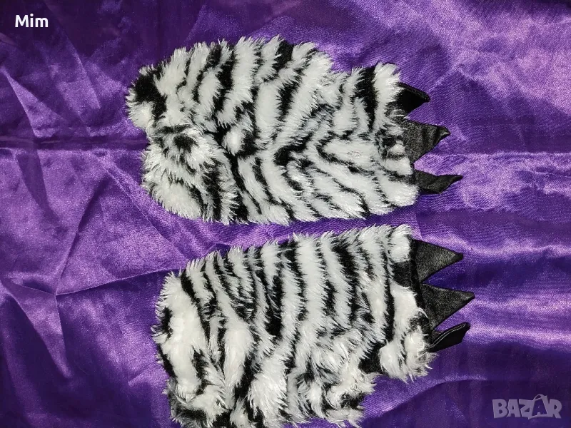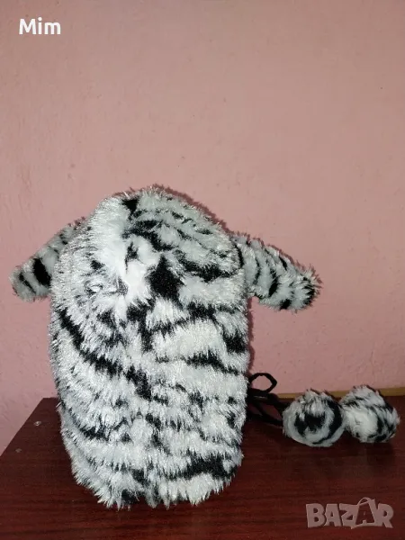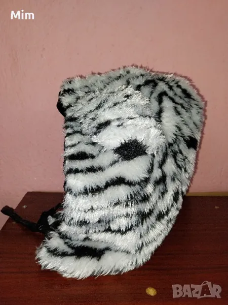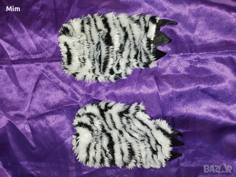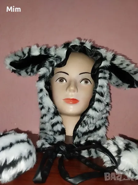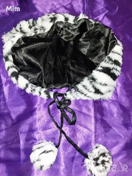 Пухеста шапка в черно и бяло имитира козина на коте с черна подплата, завързва се отпред с кожен шнур с топки и ръкавици като ръкавели с кожени нокти ,няма забележки първата снимка е каталожна,в наличност е и полата и корсета М размер на места има проблем с кожата.