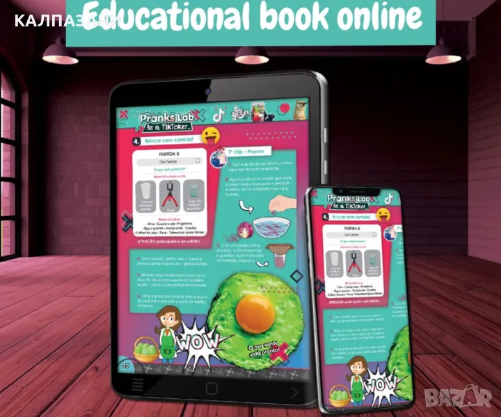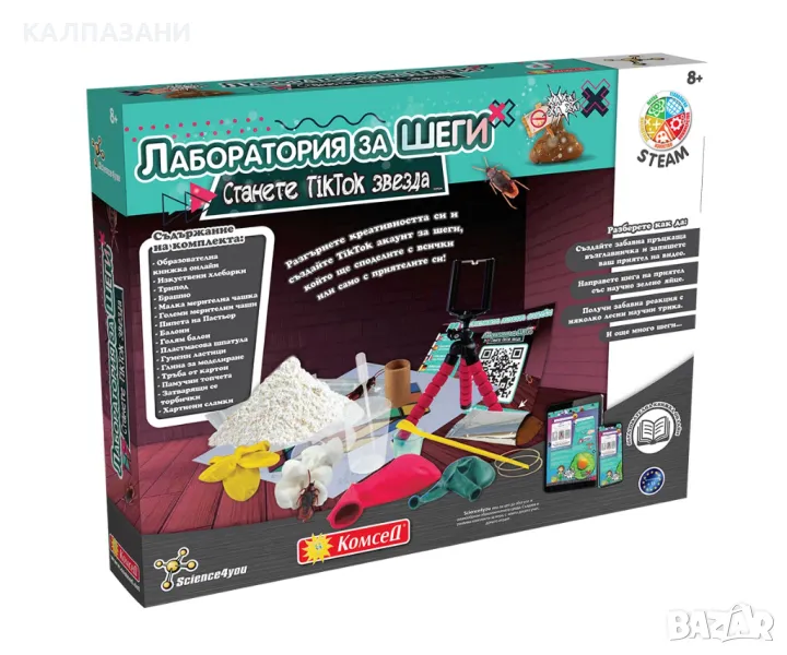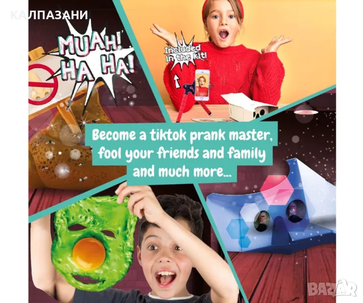 С научния комплект Лаборатория за шеги - Станете Tik Tok звезда можете да станете майстор на шеги на Tik Tok и да впечатлите приятелите и семейството си с най-невероятните научни трикове. Развихрете креативността си, създайте акаунт в Tik Tok с помощта на триножника, научете най-щурите научни шеги и запишете видеоклиповете си. Разберете как да създадете забавна възглавница за пръдня и хванете приятелите си на видео. Подмамете всички с мистериозното предизвикателство за напитка и с лудите очила, които изкривяват реалността. Всички тези и много други шеги, за да станете истински тик-токър. Играчката включва онлайн образователна книга, достъпна чрез QR кода или уебсайта (