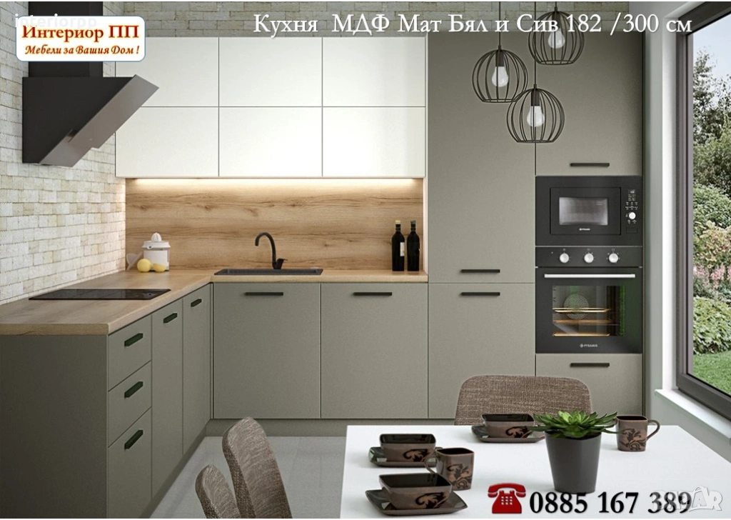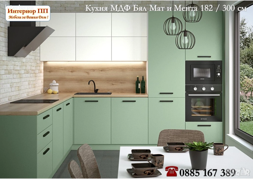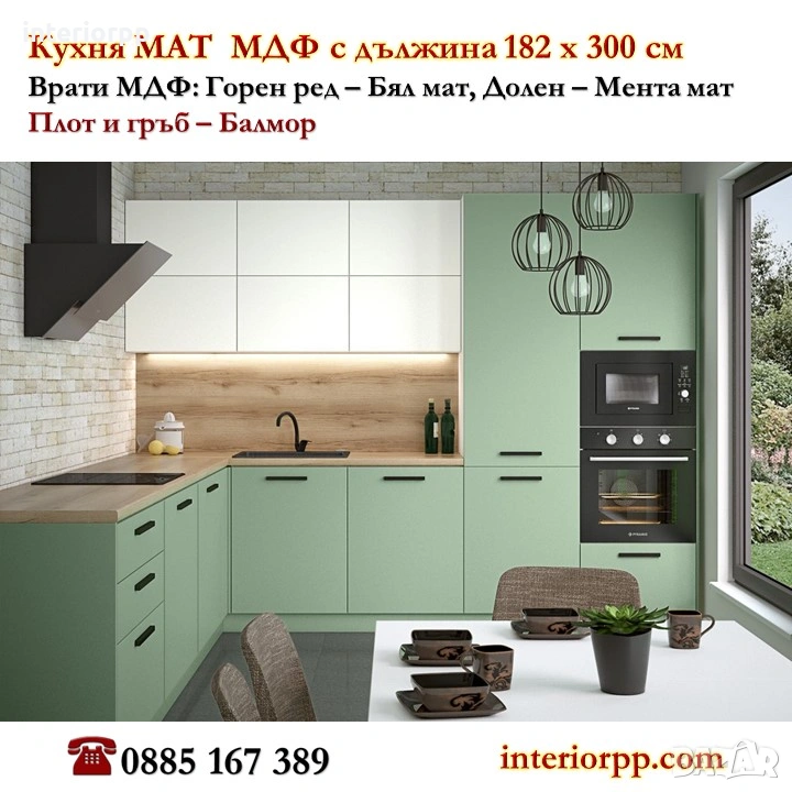 Кухня Мат МДФ 182/300 см - Мента с Бял мат - НОВО! Безплатен Проект за Вас