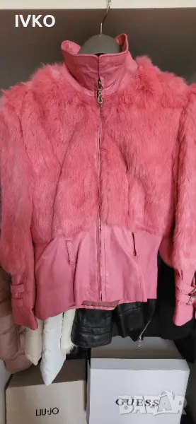 2. Кожено яке в розов цвят със заешки косъм.Размер твърдо xs. Оригиналния розов колан е изгубен. Изключително запазено, цената е съобразена със състоянието.- 150лв.