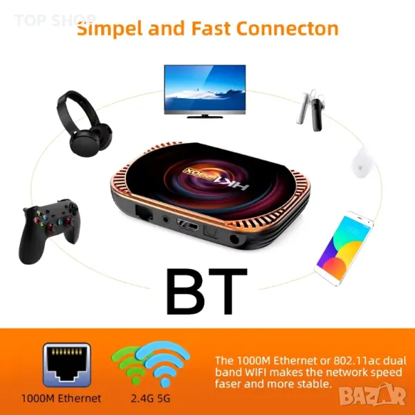 Изключително добра мрежова свързаност, благодарение на Wifi 802.11b/g/n 2.4Ghz, Bluetooth 4.0, RJ45 порт10/100 Mbit IR приемник за дистанционното.