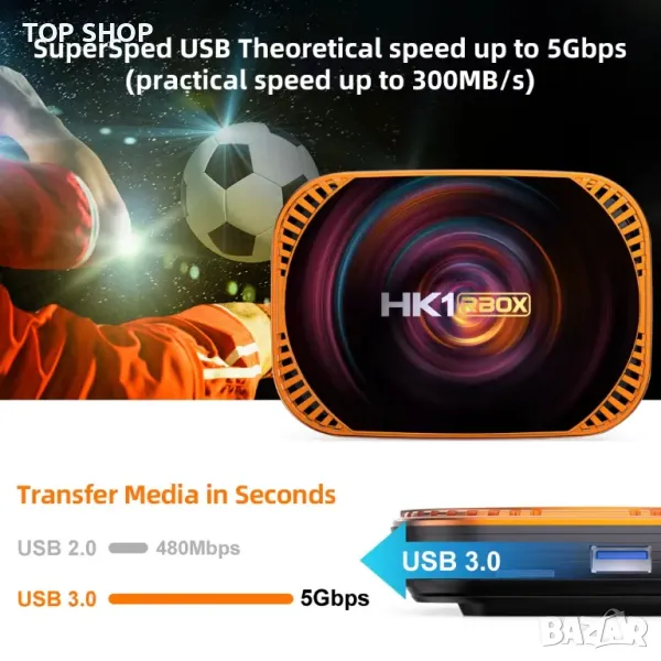 ТВ Бокс HK1 RBox-X4 4GB/32GB с процесор Amlogic 905X4 разполага с 1 стандартен USB 3.0 и един 2.0 порт. Можете да ползвате TV приставката с клавиатура и мишка. Също така можете да включите външни HDD, камери, флашки, джокстик, принтери и др. HDMI порта позволява връзка с телевизор или проектор, за да се насладите на картина с високо качество и резолюция до 3840x2160