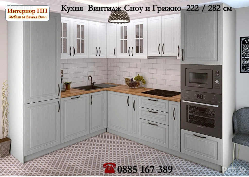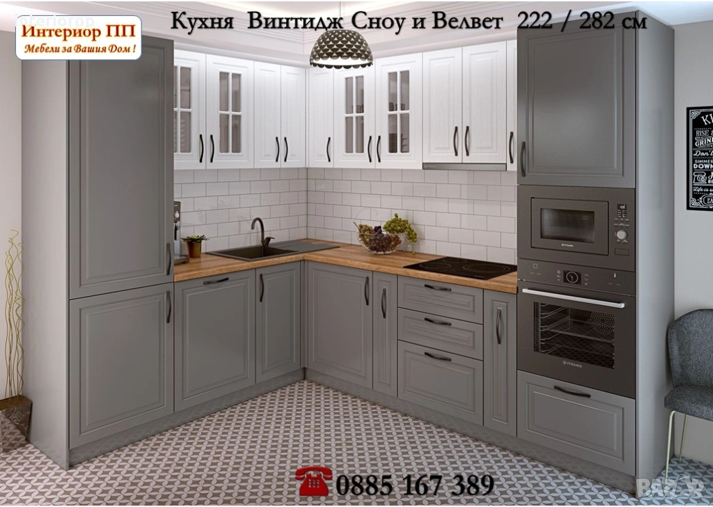 Аранжираната кухня е с размери 222 / 282 см, в цветове Велвет -сиво и Сноу - Бял МДФ