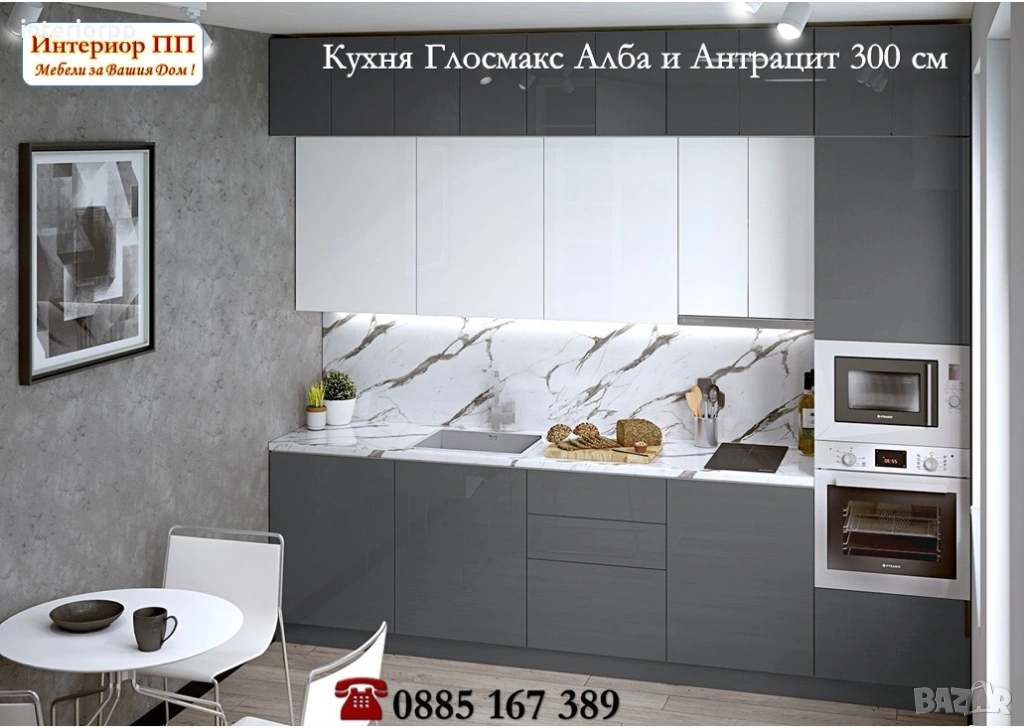Кухня Глосмакс МДФ - 300 см - Алба с Антрацит. Безплатен Проект за Вас