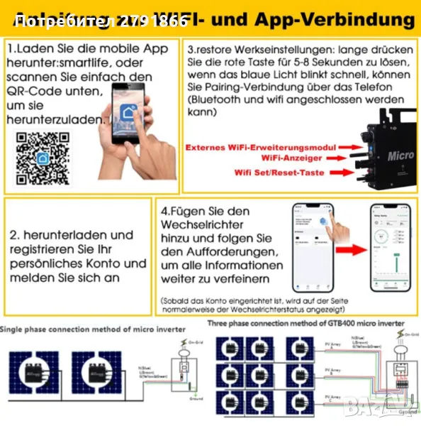 800 W микро соларен мрежов инвертор за електроцентрала на балкона с допълнителен щепсел за променлив ток, IP65 водоустойчив, DC 22-48 V, MPPT чист синусоидален изход, WiFi контрол Относно този артикул
