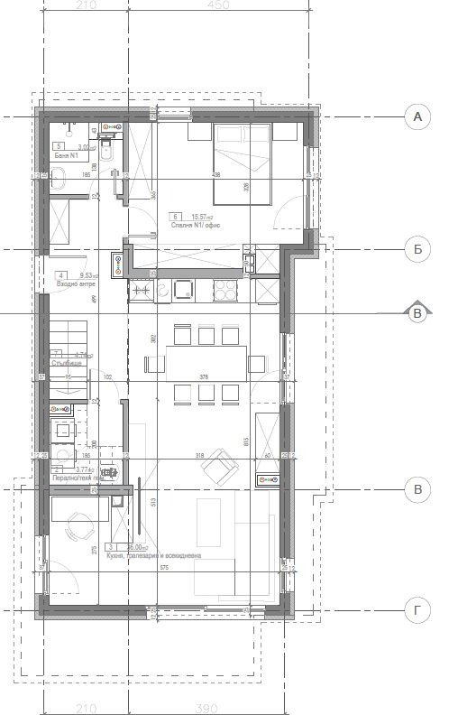 1-ви етаж (80.56 кв.м): Входно антре, просторна дневна с кухненски бокс, кабинет, домакинско помещение, дрешник, санитарен възел и баня с WC.