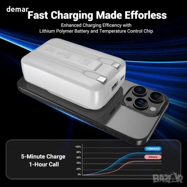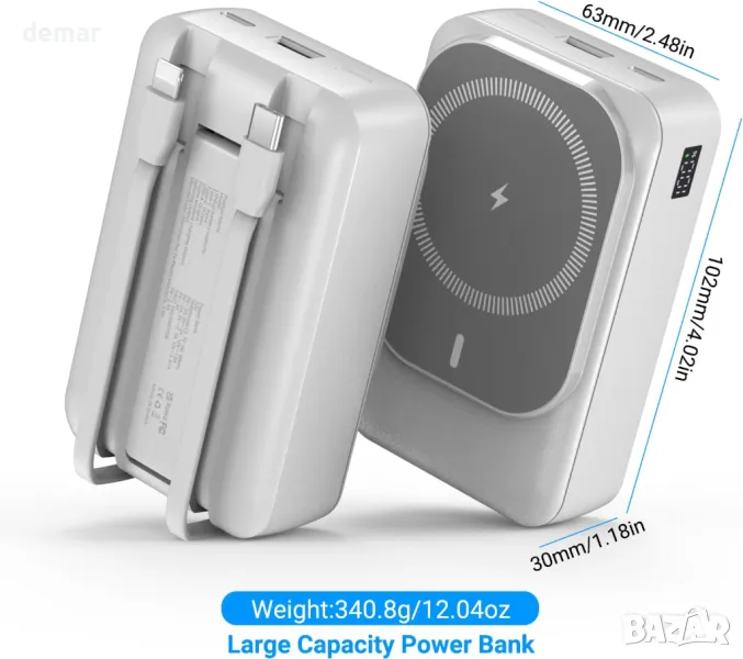 Външна батерия 26800 mAh Магнитно безжично преносимо зарядно, PD 22,5 W Type-C с вградени кабели