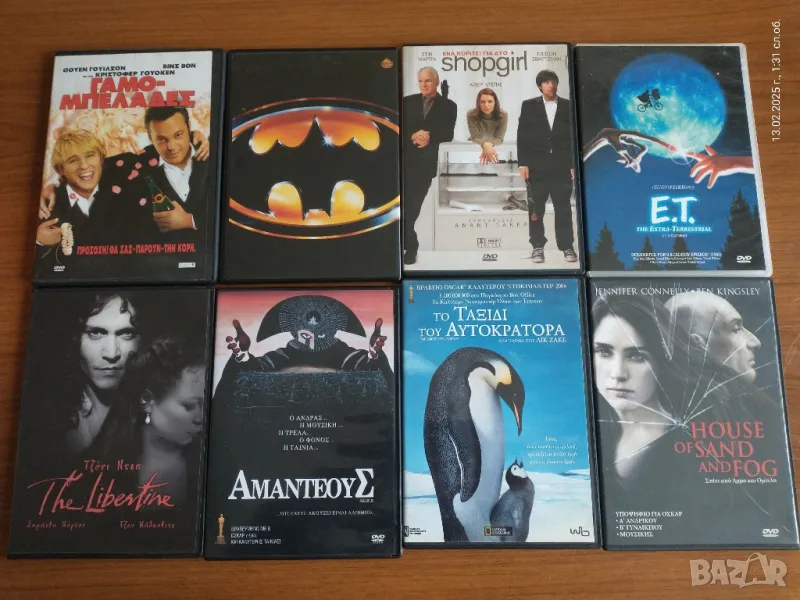 Продавам 50 студийни DVD филма в отлично състояние.Филмите са купувани в Гърция и са с вградени субтитри на гръцки език.Това не е проблем за който ги гледа на компютър, защото може да си изтегли субтитри на български език.Може да си ги прехвърли на друг цифров носител.Няма да изброявам заглавия, защото се виждат на снимките.Филмите се продават накуп за цената от 100 лева.Не ги деля!
