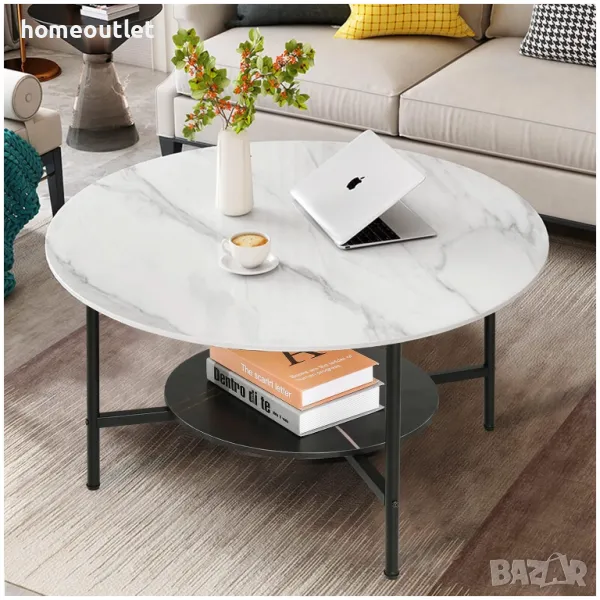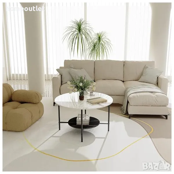 Бялата масичка за кафе е изработена от дебел синтерован камък и солидна метална рамка.