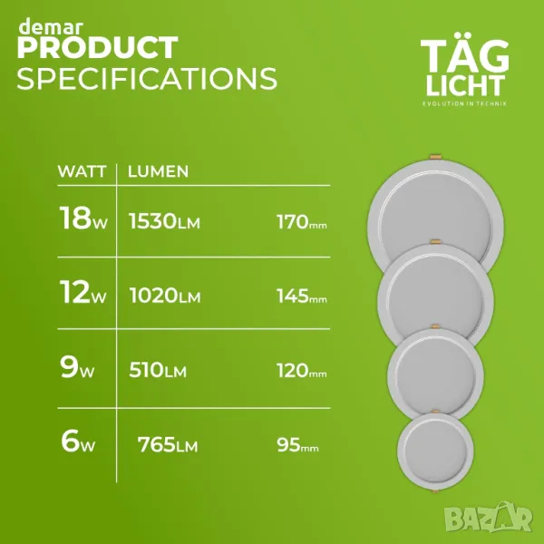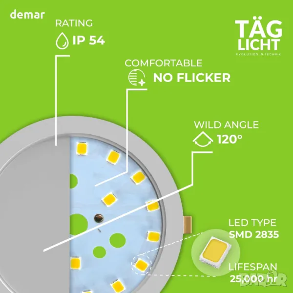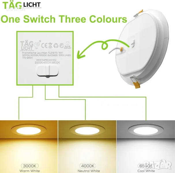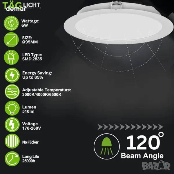 Насладете се на разнообразно осветление с регулируеми цветови температури (3000K/4000K/6500K), за да пасне на всяка среда. Проектирана в Германия, тази енергийно ефективна LED лампа за вграждане предлага 85% икономия на енергия и издържа до 25 000 часа. Елегантният кръгъл панел с диаметър Ø95 мм се вписва безпроблемно във всяко пространство със сертификат IP54 за устойчивост на прах и вода. Насладете се на мигновено осветление без трептене със SMD 2835 LED технология за постоянно осветление. Превключвайте лесно между три цветови режима с помощта на един превключвател, което прави персонализирането лесно.