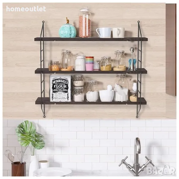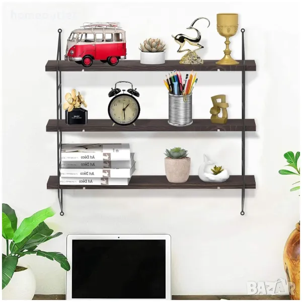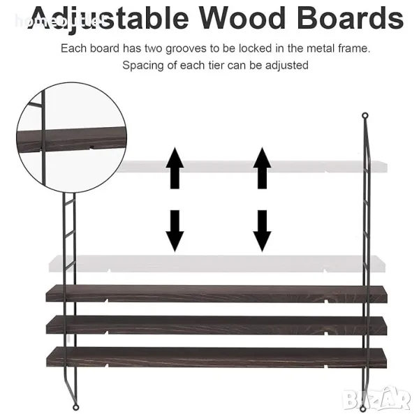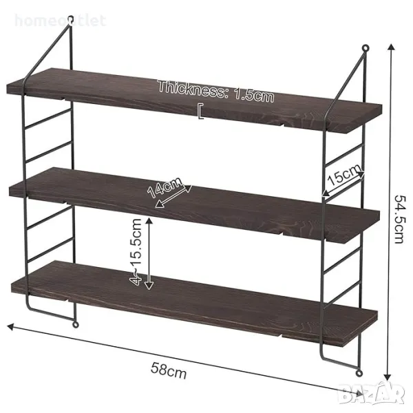 Всеки от дървените рафтове е с размери 58 x 14 x 1,5 см и капацитет на тегло до 5 кг.