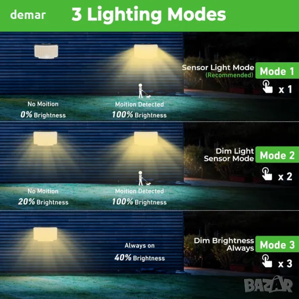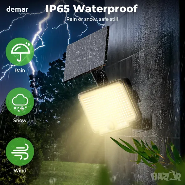 5-метров кабел свързва отделния слънчев панел със светлината, което позволява гъвкаво разположение за ефективно зареждане и по-ярко осветление. С 318 светодиода и 270° широкоъгълен дизайн, той осигурява широко покритие, докато PIR сензорът за движение открива движение в рамките на 3-5 м за допълнителна сигурност. Три режима на осветяване предлагат постоянна приглушена светлина, сензорен режим от затъмнена към ярка или пълна яркост само при засичане на движение. С IP65 водоустойчив рейтинг, той издържа на различни атмосферни условия, което го прави идеален за външни пространства като градини, пътеки и огради. Препоръчителната височина на монтаж е 2-3 м.
