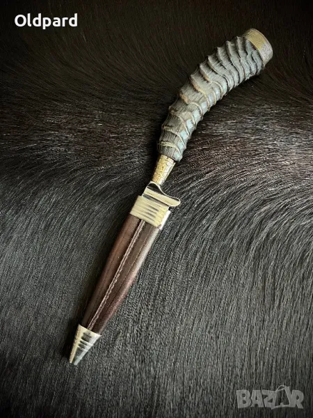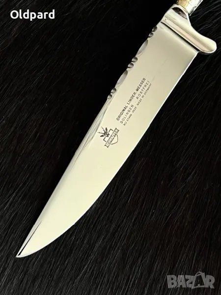 Колекционерски ловен нож Linder Solingen. немска колекция. Чисто нов режещ нож Linder Solingen. Полирано острие от неръждаема стомана 1.4116 Thyssenkrupp. Дължина на острието - 11,0 см. Дебелина на острието - 4,8 мм. Дръжки от рог на антилопа. Традиционна баварска кожена кания с метални вложки.