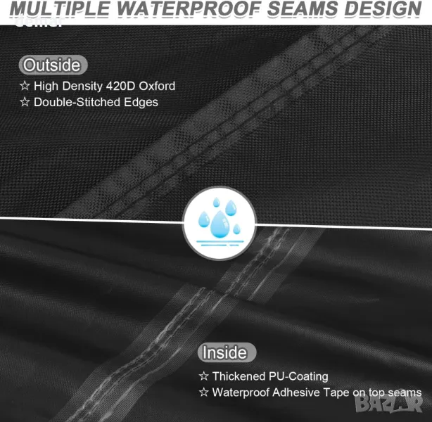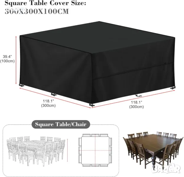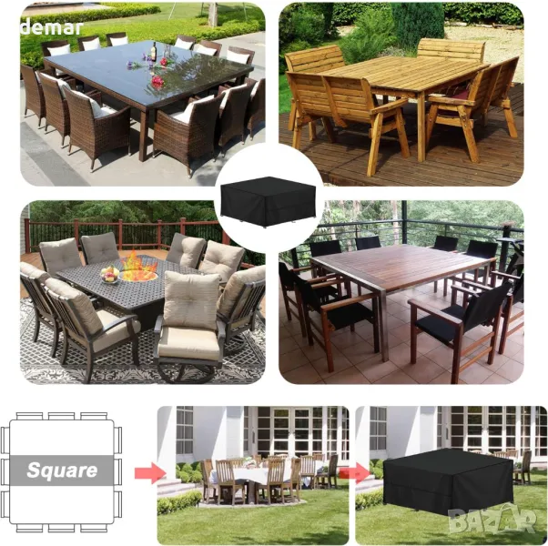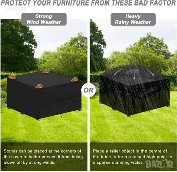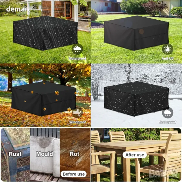 Това водоустойчиво и UV-устойчиво покритие за мебели има дебело PU покритие и лепяща лента по шевовете за защита от слънце и дъжд. Изработен от подобрена 420D оксфордска тъкан с подсилени шевове, той е устойчив на разкъсвания, драскотини, прах, влага, ръжда и мухъл за дълготрайна употреба. Ветроустойчивият дизайн включва шест ъглови катарами, два шнура и допълнителни странични ленти за сигурно закопчаване при силен вятър. Пасва на различни вътрешни и външни мебели, включително маси, столове и дивани. Лесен за използване с голям отвор, предлага се с чанта за съхранение и се почиства лесно с вода или влажна кърпа.