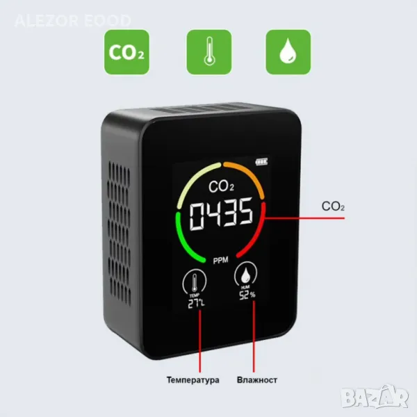 Уред 3в1 за измерване на въглероден двуокис, влажност и температура