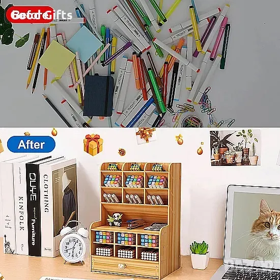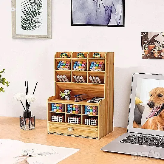 Многофункционален дървен органайзер за бюро, който осигурява удобно и стилно съхранение на канцеларски материали. Със своя здрава конструкция, голям капацитет и елегантен дизайн, този органайзер е идеалното допълнение към всяко работно място – офис, дом или учебна стая.