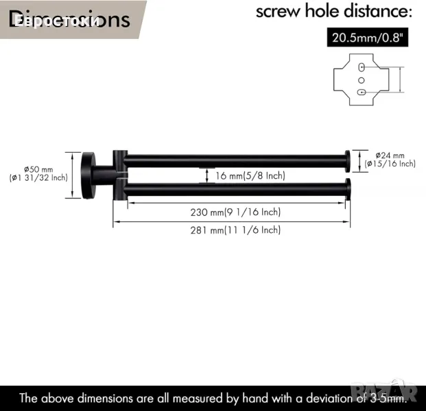 В края на държача за кърпи има крайна капачка с диаметър 24 мм. Въртящата се релса за хавлии е внимателно проектирана с кръгла крайна капачка, която предотвратява изплъзването на кърпата.