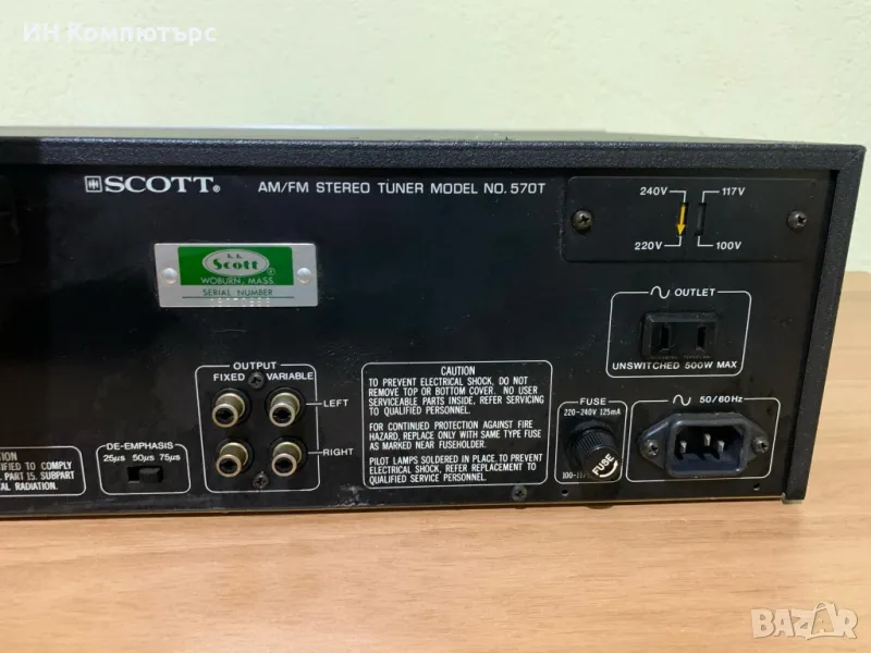 Scott 570T е винтидж AM/FM стерео тунер, произведен от HH Scott в края на 70-те години (около 1978–1980 г.). Известен е със своята здрава изработка, аналогово скалиране и топло звучене. Често се използва заедно с усилватели като Scott 460A, 420A или 480A.