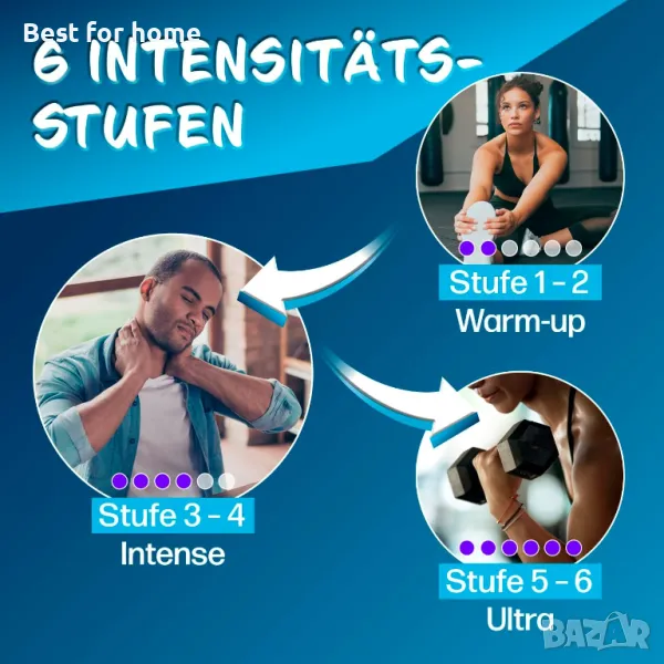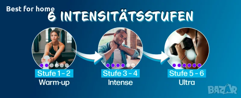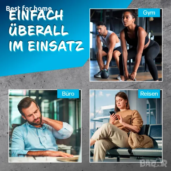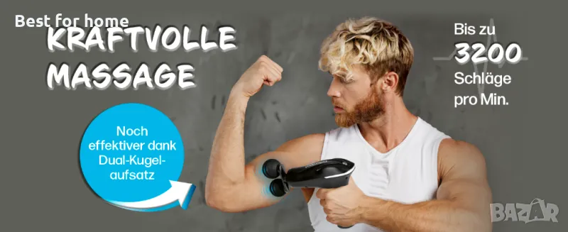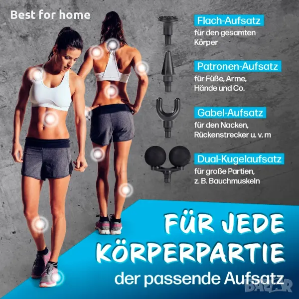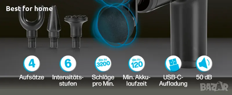 4 приставки: масажирайте перфектно различни части на тялото, включително приставка с двойна топка за още по-ефективна употреба, например при масаж на раменете, шията, гърба, краката или задните части. Насърчава кръвообращението и осигурява по-бързо възстановяване при напрежение и болезненост.