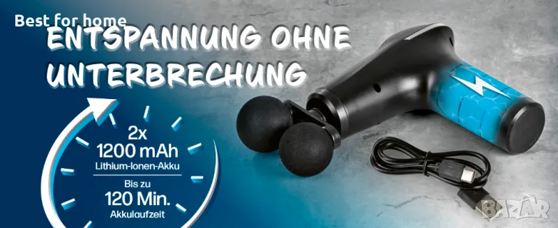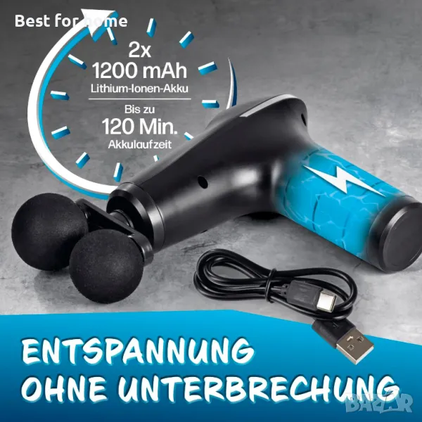 Винаги и навсякъде: благодарение на литиево-йонната батерия (1200 mAh), можете да вземете компактния масажен пистолет със себе си и да го използвате навсякъде - независимо дали у дома, във фитнеса или на почивка. Батериите са нещо от миналото! Заредете пистолета след време на работа (макс. 120 минути). удобно чрез USB-C. Идеален за масаж в движение
