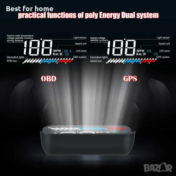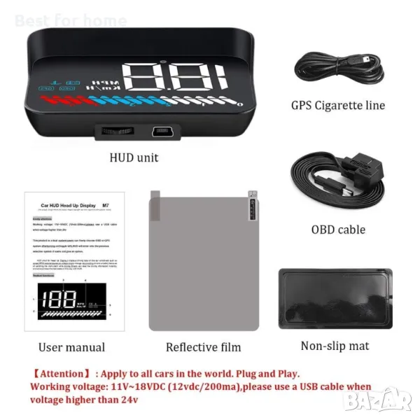 Бележки: Head-Up дисплей с два режима: OBD2 и GPS, съвместим за всички автомобили. Просто включете и пуснете, 11V~18VDC (12VDC/200MA). Използвайте USB кабела, когато напрежението е по-високо от 24V.